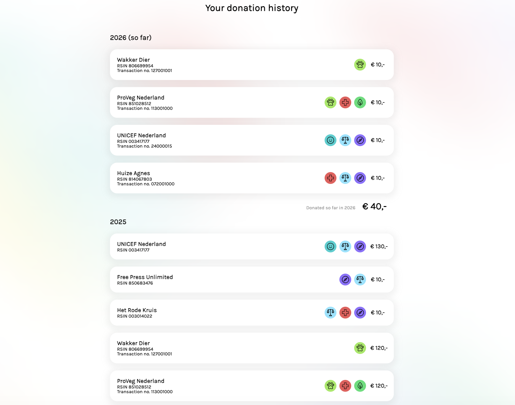 For ‘Gift aan’ (‘Donation to’), you fill in the name of the charity. The RSIN (identification number) is filled in automatically. In your donation history, you can find the RSIN to verify that you have selected the correct organization.